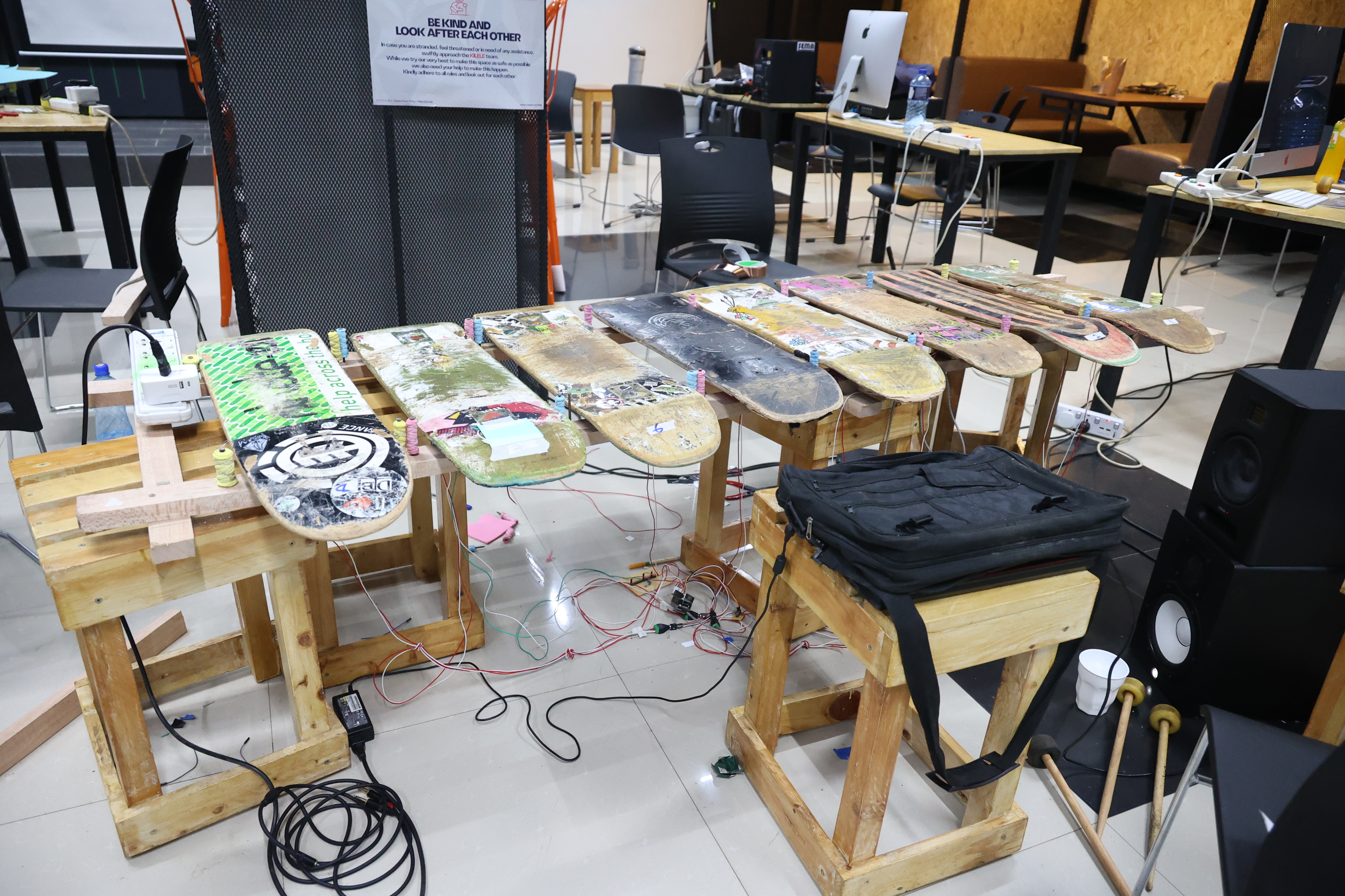Special attention should be paid to the Embaire project, which saw Samuel Karugu, Basile Huguenin-Virchaux and Astrid Bin create a xylophone / synth out of skateboards. This project was supported by Pro Helvetia Johannesberg.